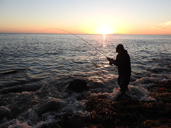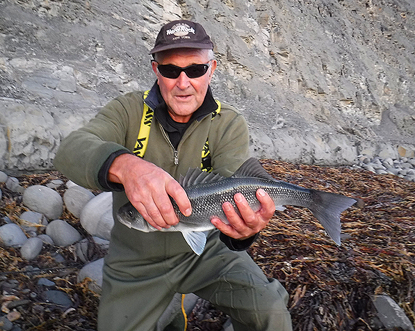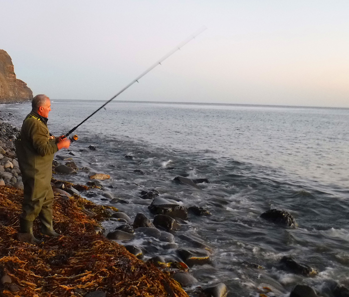 By the end of British Summer Time it's getting tricky to match tides and the hours of daylight for surface fishing. The mullet only get going for Coelopa maggots on the biggest spring tides and by late October these usually fall after dark. I'm sure the fish are still there but it's not funny scrambling over boulders in the dark and there's a real riskof breaking rods or even bones. Anyway, with my pals Bill and Nigel we'd decided to give the maggot feeding mullet a last go this week. I've been promising to show my new next-door neighbour Martyn how we fish for these fish and the bass that often keep them company, all summer; so this seemed like the last good oportunity for him to tag along. Although Martyn is quite a keen sea angler it turned out that chest waders are not part of his outfit so, to save a soaking initiation, I loaned him a pair of mine for the evening.