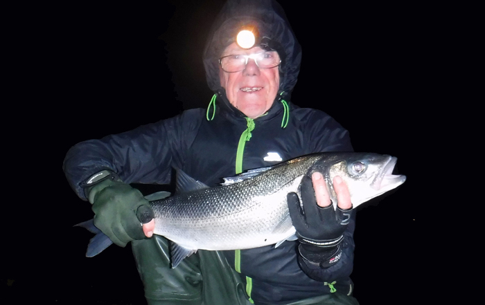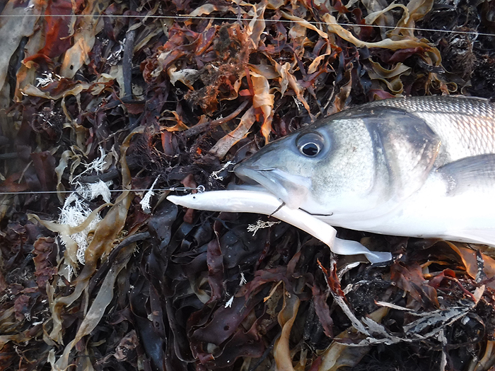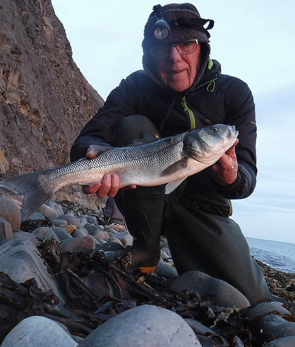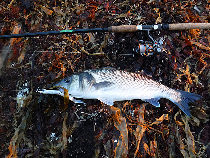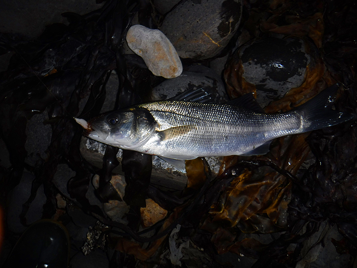 As I trudged along over the boulders thinking about the change from one night to the next I decided to get up the next morning and have a try with a free-lined bait. Back at the house I dug a mackerel fillet out of the freezer and popped it into the bucket in my car boot to be thawed out ready for the morning. I was up at 04:30 and soon on my way to the coast. I walked a short distance to a sheltered spot (always easier for free-lining, blustery wind can be a pain), flicked the bait out a couple of metres into very shallow water, left the bale arm open and waited as the tide rose. I was dressed in several layers of warm clothing, waders, hat, scarf and gloves but after fifteen minutes my finger tips holding the line felt as though they were frostbitten. I alternately tucked each hand into my jacket pocket to warm up for a little while and held the line in my free hand. About three-quarters-of-an-hour passed and it was the turn of my right hand to freeze. The rod butt was tucked under my right arm and my index finger was hooked round the line on the edge of the spool. There was a sharp pull on the braid and I quickly took my left hand out of its cosy pocket. Already the line was beginning to whisper out from the spool. As I held it between my finger and thumb it ran faster and faster. I took a pace forward to give a spot of slack and closed the bale. The rod began to bend and there was a big splash out in the darkness to my right. The clutch of the Shimano started to buzz and there was more surface splashing. The bass fought on the surface as it was pumped all the way back to where I stood, eventually I reached down and took the nylon trace to slide it ashore.