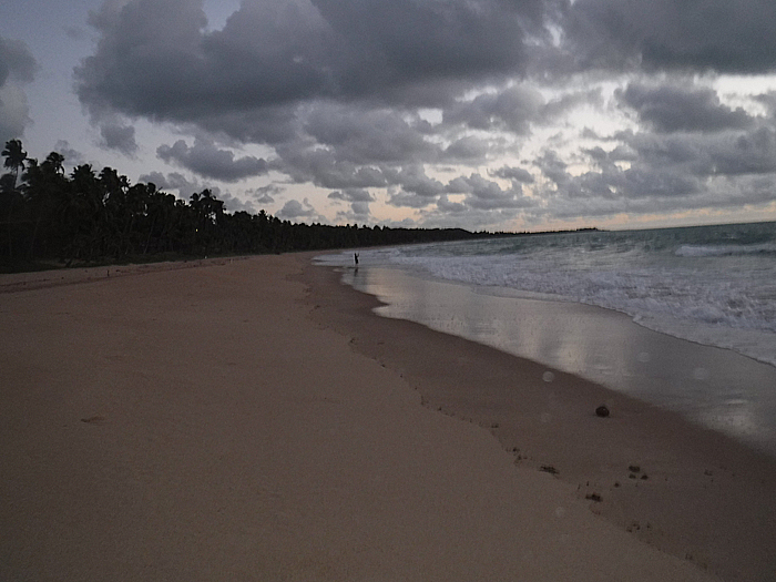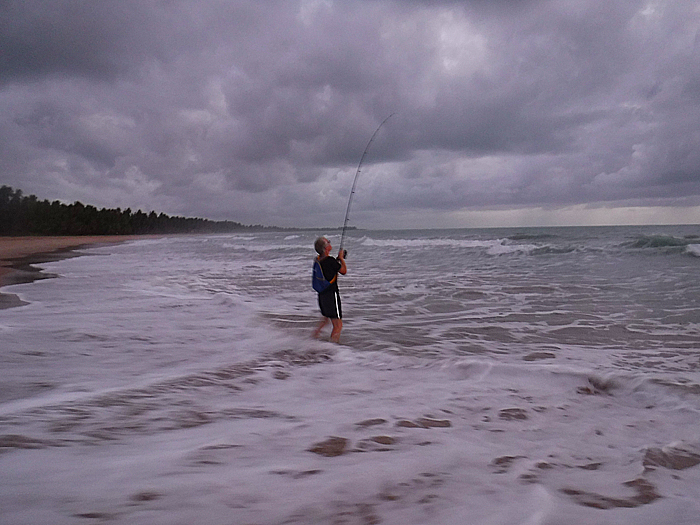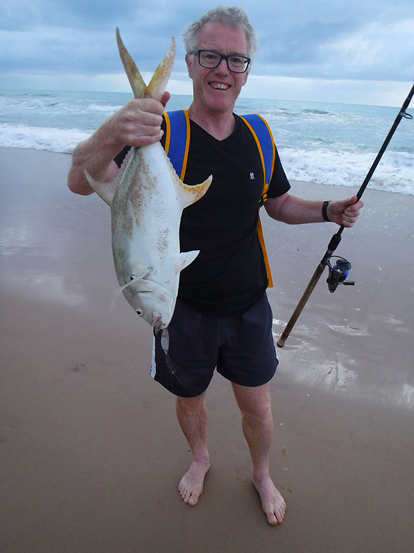Towards the end of the holiday we were winging out our metal lures from Pratagy again. Even though Rich was some distance away and the surf was too heavy to hear him call I saw at once from his movements that he was into another fish. I reeled in, grabbed the camera and headed along to watch. Sure enough it was another decent fish and as it slid ashore we thought it was the biggest leatherjacket ever (they grow to about 30cm). A look at 'FISHBASE' on the internet suggests that it is in fact a larger species but still near the maximum size for the type. Cracking specimen! Shortly afterwards my son had another bite in the breaking surf, which he missed. Three bites and two fish in half-as-dozen short sessions - for sure he'll be back in the near future and because this place can be fished on any tide and almost any weather conditions - it's a good new venue for him.