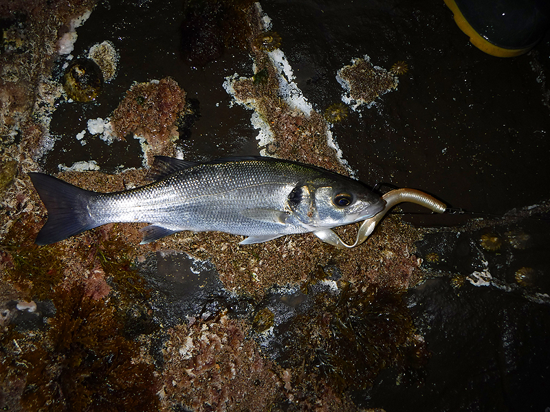 My next interesting trip didn't produce any pictures. Following a futile session, with three pals all armed with the spinning and fly gear, in search of maggot feeding mullet I went on my own the next evening. On the first trip the maggoty weed had been seperated from the maggots by a band of fresh, maggot-free kelp. On my lone trip the tide was a bit higher and the sea was calmer. This time as high water approached a two metre wide band of floating Coelopa larvae lined the edge of the sea. Every so often one or two good sized (6-7lb) bass would rise and gulp in a mouthful of maggots. The fish were feeding within inches of the edge in the breaking waves and weedy, dirty water - very difficult to fish. I tried spinning with a range of soft plastics and fly fishing with both maggot flys and Delta eels. No joy apart from a couple of tentative plucks on a weedless Redgill.