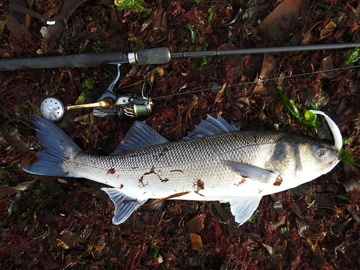 The first place I tried looked crap - not much weed, clear, bitterly cold in the east wind. Fished for an hour then went for a walk, fished for the best part of a mile of rough, rocky shoreline. Got to the end and thought that's it I'm going home. One last cast (at 09:00) and had one hell of a bite and landed a cracking 61cm fish after a good scrap. Very fat - didn't look spawned out 'HOORAH!' After photographing the fish I had another bite two casts later.....another heart in mouth fight and an even better fish on the beach. 71cm! 'DOUBLE HOORAH!' I wanted to weigh this fish out of curiosity but my scales are f*****d can anyone recommend some good digital scales? According to the BASS weight v length chart a 70cm fish is 8.4lb and a 72cm fish is 9.17lb so I'll take 8.75lb :). Of course I fished on for an hour - no more bites. On the way back to my car I came to a small bay and it was alive with fish - I could clearly see the tails, not pointed top and bottom like mullet but slightly rounded like bass...I had one cast and hooked a fish and it was yet another beauty at 69cm\8lb!!!! 'TRIPLE HOORAH!' After I'd landed the fish the rest disappeared but I stayed for an hour just in case. Another run of the mill fishing trip.