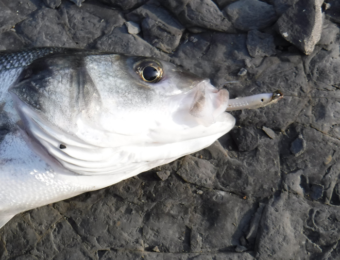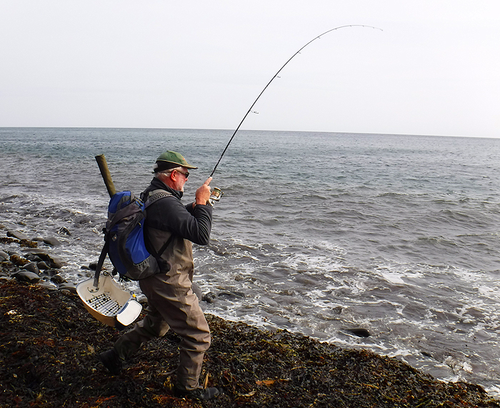 By the time I caught up with the others they were already casting their weedless soft-plastic eels into the rather choppy, slightly murky water. A decent swell was breaking at the edge of the sea and threatening to give us a good soaking every 'seventh wave'. I asked how it was going and was encouraged to hear that Nigel had already had a bite. I joined in the cast and retrieve scenario but my plug was picking up too much crap on its treble hooks so I decided to change it for a large, white SlugGo lure. By the time I'd swapped lures Nigel gave a shout and I looked up to see his rod well bent. Instead of fishing I grabbed the camera and started to take a few pictures of the action.