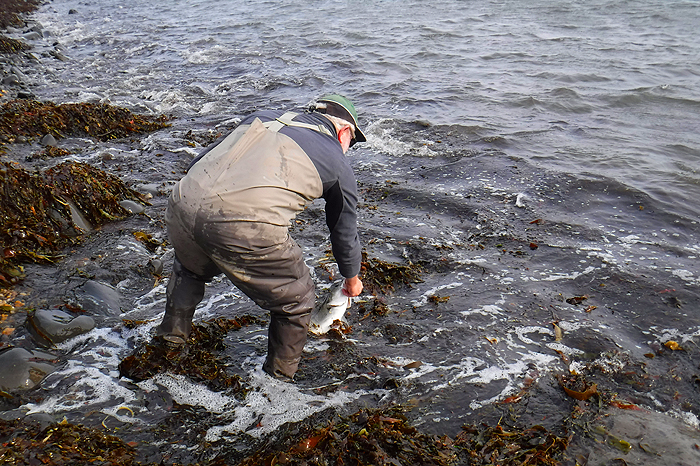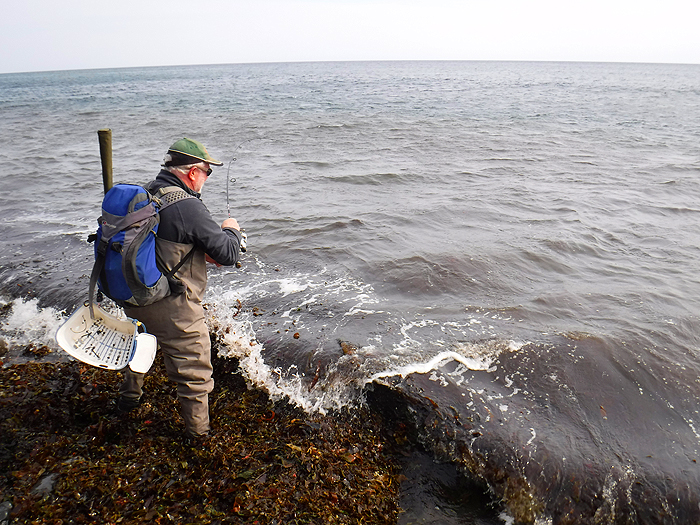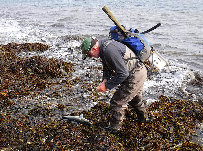 I grabbed the spinning rod armed with a J11 buoyant Rapala and the fly rod carrying a small, white Delta eel and set off in pursuit. As I trudged along on the long hike and rounded the first corner in the cliff I could see my pals in the distance. No point in trying to catch up so I put my head down and plodded after them. Fifteen minutes later my goal was in sight and I could see huge piles of weed just where I expected them. A big flock of black headed gulls was already gathered in the water's edge in anticipation of the maggot fest to come. Magic!