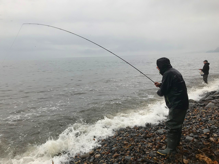 At last! I'm into a thicklip on the fly. Nigel's fly fishing in the background.