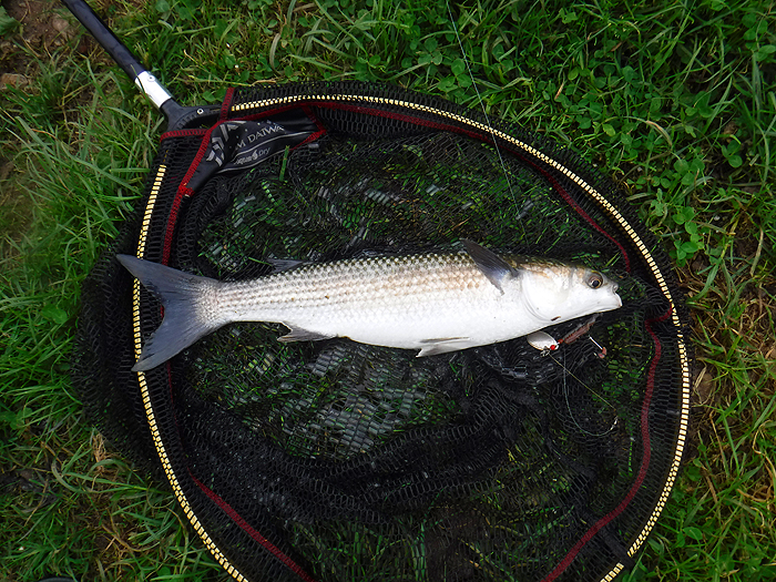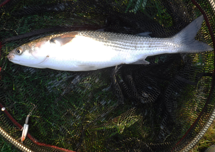 Still smarting from the missed bass bite; later in the week I went for an hour one evening in search of seatrout on my local river. There was a modest hatch of mayfly but, as is often the case, nothing was rising. I spun a J9 Rapala and after an hour without a sign a fish finally attached itself, just as the lure came to the bank. It turned out to be a modest thinlip nicely hooked in the mouth on the tail treble of the little plug; very unusual. I fished on and saw a couple of bow waves behind the lure which I took to be more mullet. I had no more bites.