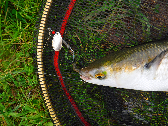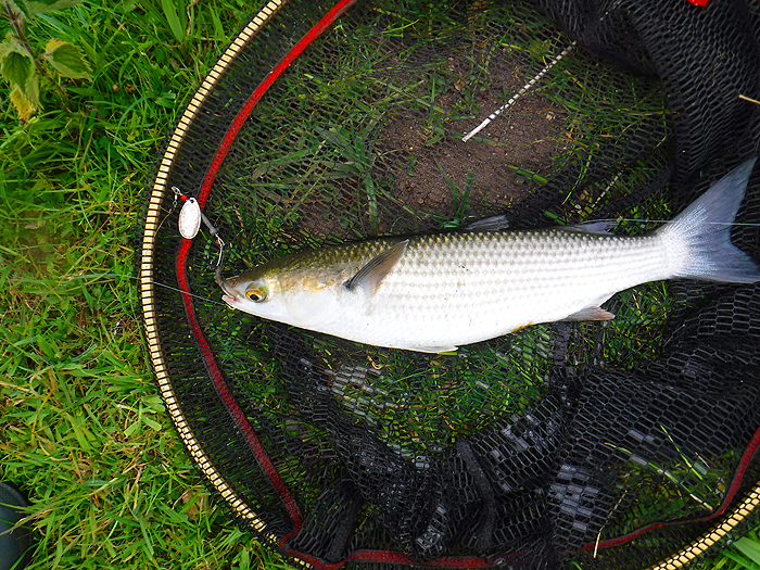 I grovelled in the lure box to see what was there. There was only one mullet spinner so I clipped it on. When I noticed that the worm spun almost as fast as the blade I wasn't happy – it's never good when that happens. However I immediately saw bow waves of fish following the lure, really exciting stuff. Despite my less-than-perfect-spinner in under an hour I landed four thinlips to 3lb+ and dropped two or three more before packing in. A very enjoyable session. Now for that big bass?