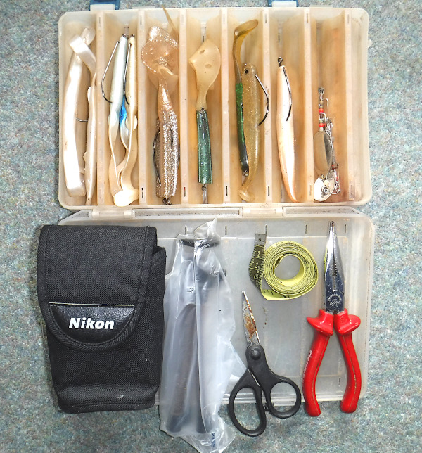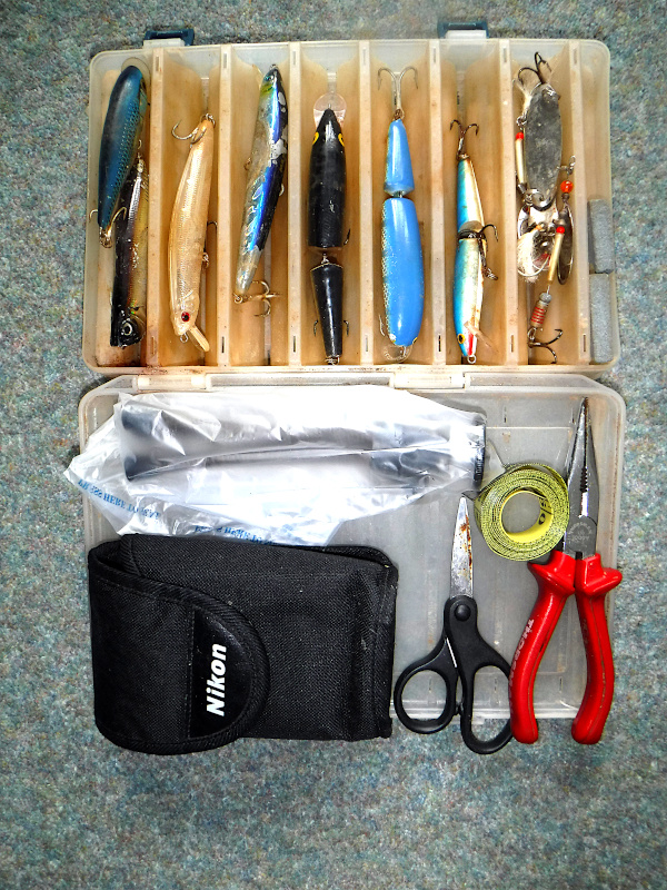 Large box with hardbaits, spoons, wedges, spinners and sharpening stone; plus my pliers, scissors, tripod, measuring tape and camera.