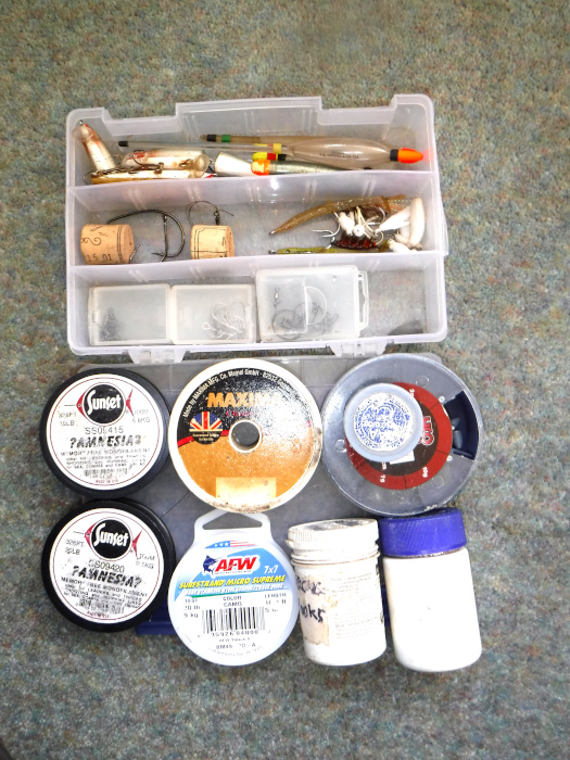 Small box with small lures,floats,corks,'flies',swivels, clips, traces, etc; plus spare trace materials, weights and circle hooks