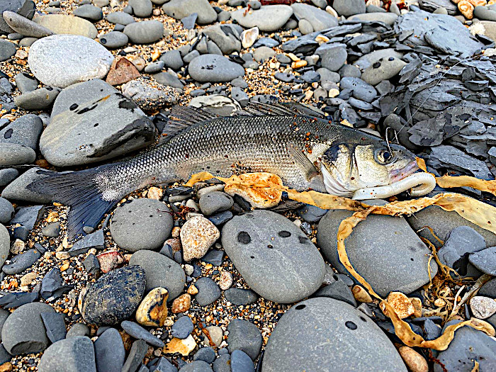 The first change in plans was that my visitors had to cancel and the second was that Bill made it home in time to join me. So we went. We met in the car park and walked to our prospective stretch of shoreline. On the way we passed one small weed midden but optimistically continued to the place we'd first intended to fish. When we arrived there was a bit of a swell, a fair amount of weed soup in the edge and no sign of maggots or of any fish activity. We began to spin with plastic eels and almost at once Bill had two pulls on his Slug-Gill which he said felt like small fish. Then, for half-an-hour or more, neither of us had a bite. We wandered back and forth along the cobbles, casting and retrieving. Eventually Bill came back and announced that he'd caught a very small bass - better than nothing. Shortly afterwards I also had an even tinier bass on my Redgill. Then it was dead again.