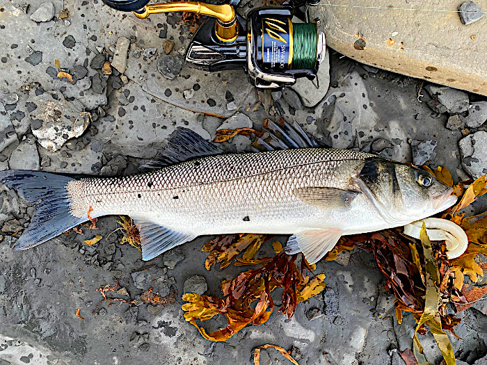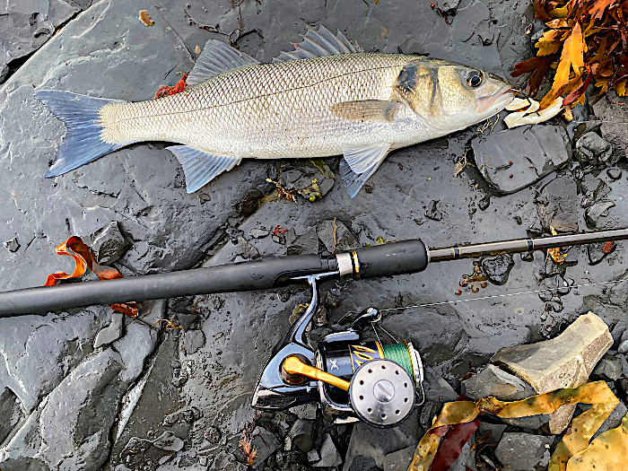 After about an hours fishing, round about the time of high water, we noticed a flock of black headed gulls on the sea, back at the place where we'd seen maggoty weed as we walked along. It was a no brainer, so we tramped back to the spot. As we approached the gulls flew off but clearly there were some maggots washing out into the sea. It was not long before a few (a very few) mullet turned up in groups of two or three skimming the surface, but they were too far out and the cross-wind was far too strong for fly fishing so we continued to spin. The tide was turning and now we noticed groups of small bass striking at the surface as they gulped in the tiny maggots. Before long Bill's rod bent as he hooked a bass a little larger than the ones we'd had earlier. A few minutes later he landed a third fish of round about two pounds. At this point, having missed a couple of bites on my Redgill, I switched to the J9 Rapala which I had recently used in the river. We were both having the odd missed bite and it became clear that any cast which brought the lure close to a group of foraging schoolies was likely to result in an attack. Eventually I hooked a fish on the Rapala, and it proved to be (only just) the largest of the session. By this time we'd both had enough, so we packed in and walked back to the cars. As Bill commented "What looked like being a rubbish session had turned out to be not good but about average".