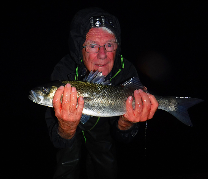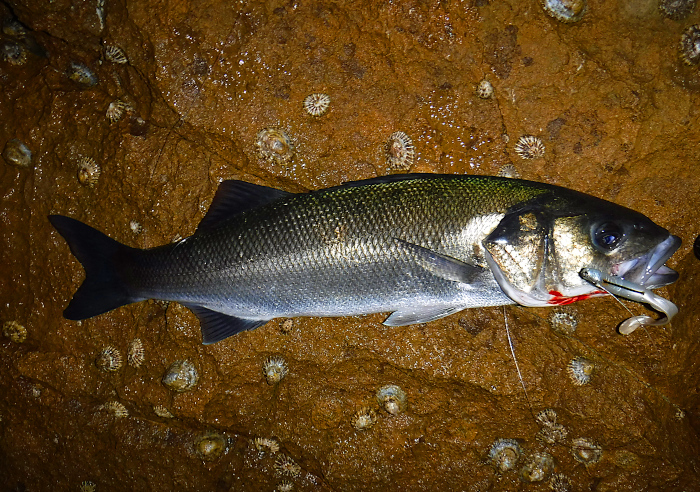 I had a couple of casts to ease the line off the spool, and then made a very short chuck of about five or six metres so that the lure would swing quickly round into the eddy just off the point of the ledge where I stood. Wallop! The little rod arched round and I was in. The fish rushed out into the fast water taking several metres of line as it went. Clearly it was bigger than the usual two-pounders that I'd had recently. With the fast flow and the strong swimming fish it was a few minutes before I could slide my catch ashore. A nice bass of perhaps four pounds. I picked it up to carry it to where I'd left the bag and the camera; as I did so it kicked and pulled the hook into my left thumb. I twisted my thumb free of the hook and continued on to do my photography. There was a bit of blood on my fingers but I managed to take a few pictures including a selfie before measuring the fish (which had by this time unhooked itself) and returning it to the sea.