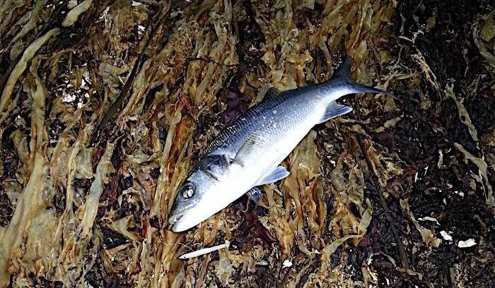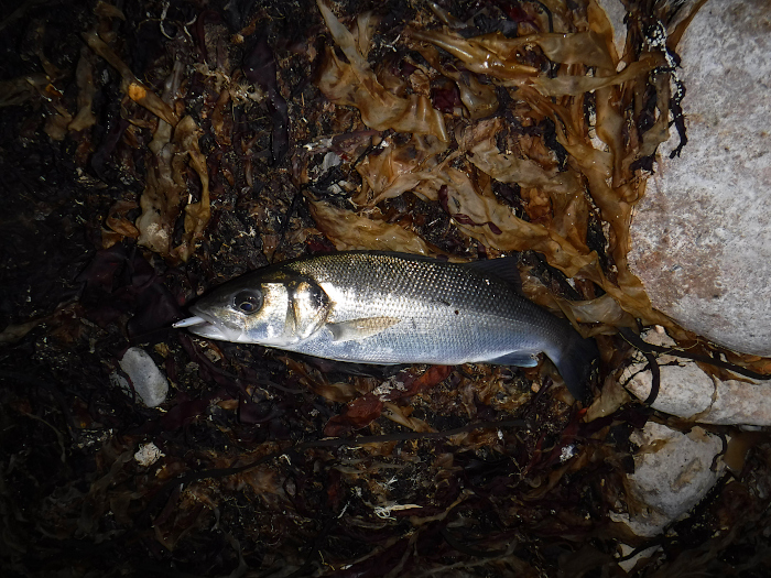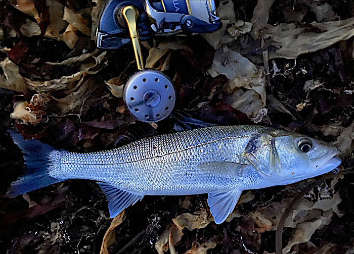 After a few minutes of cast and retrieve I was in and the fish fought pretty well, taking line and rushing up and down along the shore but with none of the sustained runs I would expect from a big fish. I began to suspect that it might not be hooked in the mouth (foul-hooked fish often fight much harder). When I eventually slid it ashore it turned out to be a small bass hooked near the wrist of its tail. Disappointing!