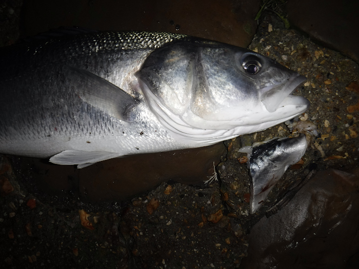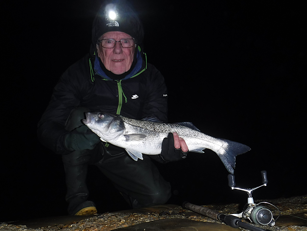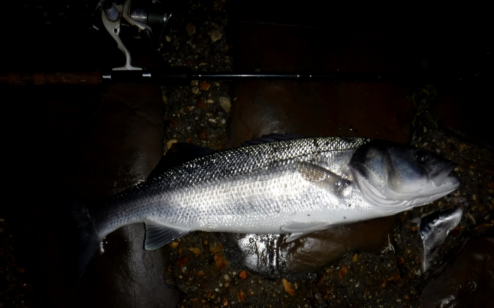 As I played what was obviously a decent fish Martyn began to reel in, out of the way, but the fish had already fouled his line as it ran off with the bait. I switched on my headlamp and could see Martyn's trace twisted round my line. There was nothing for it but for him to open his bale arm and let me play the bass plus his gear, hopefully without too much risk of an immovable tangle. As the fish drew nearer we both stepped backwards and eventually, with a sigh of relief, I slid it ashore. "It's a nice fish Mike!" Martyn said and sure enough it was a lovely, fat silver bass.