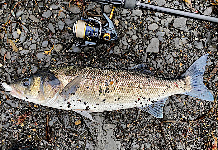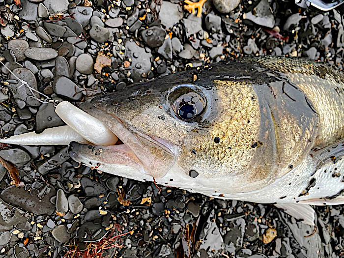The following day I had an email from my pal Bill. He'd been spinning, on the morning after our session, a mile or two west of where we caught the bass. Having started at about 06:00hr he'd walked and fished for quite a way with no sign of anything. He says that the sea was often coloured and quite rough apart from a few clear areas around the rocky ledges. He tried with a Sluggill, an Albie Snax and a Pulse tail but nothing produced until he was making his way back at about 09:40, when he hooked a nice fish. In his own words " I was chuffed, as I thought I was going to blank despite the nice conditions." After that he had a few more castsl on the way back to the car but no further bites. Nice one Bill!