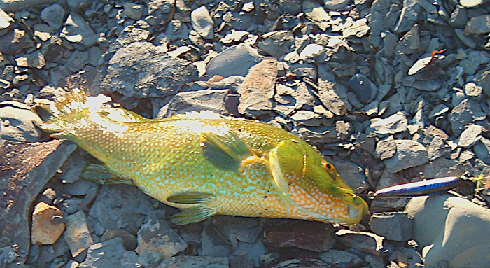 This nice wrasse nipped the tail of the plug 'possibly thinking that it was a competitor in its territory?'.