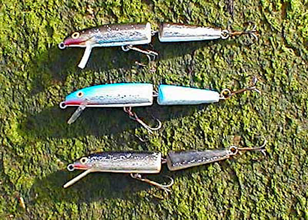 Buoyant Rapala plugs with modified lips. The top one is the shallowest diver and the bottom one the deepest. The positions of the hooks allow for mid-body strikes and tail nipping. Reducing the size of the tail treble improves action and hooks tail nippers better.