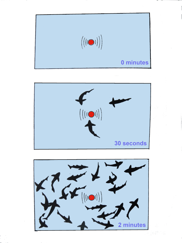 Low frequency sound is emitted from the speaker (red) to attract sharks. The pictures depict the number of fish present after switching on.