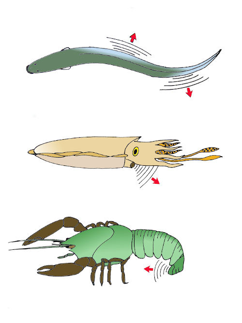 The foods of such predators fall into a few groups, which include fish, squid, crustaceans, and large insects. The fish which they eat swim either by long-wave wriggling as in eels, short-wave sculling with the tail as in mackerel, or by various forms of paddling with the fins. Squids and cuttlefishes also propel themselves by undulations of the fins but, more often and more quickly by pulsed jets of water from the siphon. Some large dragonfly larvae are also ‘jet propelled’. Crustaceans such as crayfish, lobsters, squat-lobsters, shrimps and prawns, dart backwards, propelled by swift thrusts of the paddle-like tail. All these animals are, more or less, streamlined in shape. In choosing lures the size, body profile and swimming action of the prey that they are meant to represent should probably be a prime consideration.