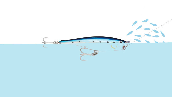 Surface-popping lures and sliders attract predators by creating a spray of water which resembles the flash expansion of escaping preyfish..