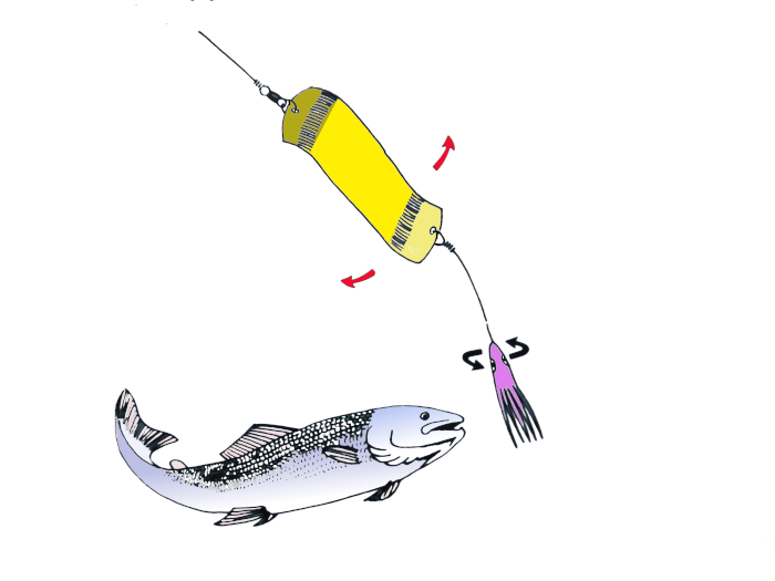 The most interesting aspect of the method is that the trace between the flasher and the small lure is so short and that the wild gyrations of the flasher are intended not just to attract the attention of salmon but to make the Hoochie dart and twist wildly in its wake – yet the fish still take it! Would anyone here dream of trying a method like this? I doubt it. Yet bass, cod, ling or pollack might be expected to respond to similar tactics. Scaled down it could possibly be applied to other species.