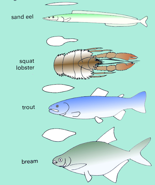 Of course, size of prey is only one feature among many. The next obvious thing for the lure fishermen to take into account is the shape of the common food items. Are they thin or fat, slimline or deep bodied? There is probably not much point in looking for an exact imitation and, as long as your lure is roughly the right shape, most predators do not seem to be particularly fussy. Pike, which are used to feeding on, for example, bream, will be on the look-out for fish about three times as long as they are deep. Bass, which are searching along wrack covered ledges for wrasse, are also likely to be switched on by a meaty mouthful. In contrast, sea trout, pollack or mackerel with sand eels on their mind, will have a fixation for fish about eight times as long as they are deep. The lure should be chosen accordingly. Prawns and squid will create a roughly conical or wedge-shaped search image. Crayfish or squat lobsters may produce an overriding impression of trailing pincers or dangling legs. If trout fly-anglers have shown it to be worthwhile to make each tiny imitation closely represent a certain insect (I have to say that I’m not convinced that this is the case), then it could be even more important to match the form of a decent square meal. Shape clearly does matter as it has been shown that crucian carp develop a deeper body shape in the presence of pike. Presumably being a bit fatter (deeper) in the body means that only the larger pike will think of them as a tasty morsel.