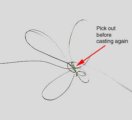 3. In the event of a small tangle or knot in the braid it can usually be picked out provided it is not pulled tight. Otherwise, cut away the tangle and start again. NEVER fish on with a knot in braid – it WILL break.