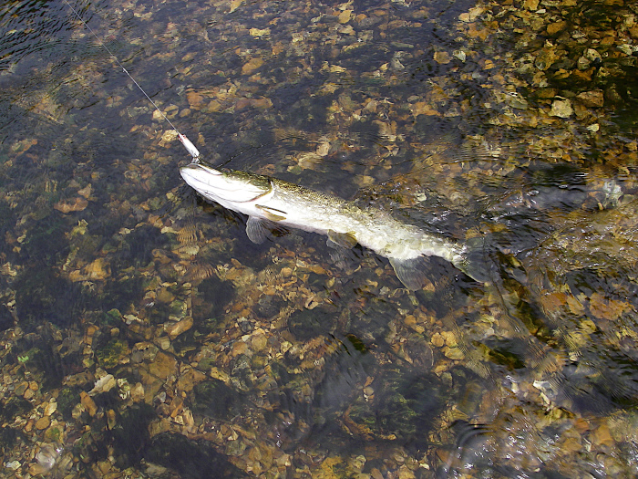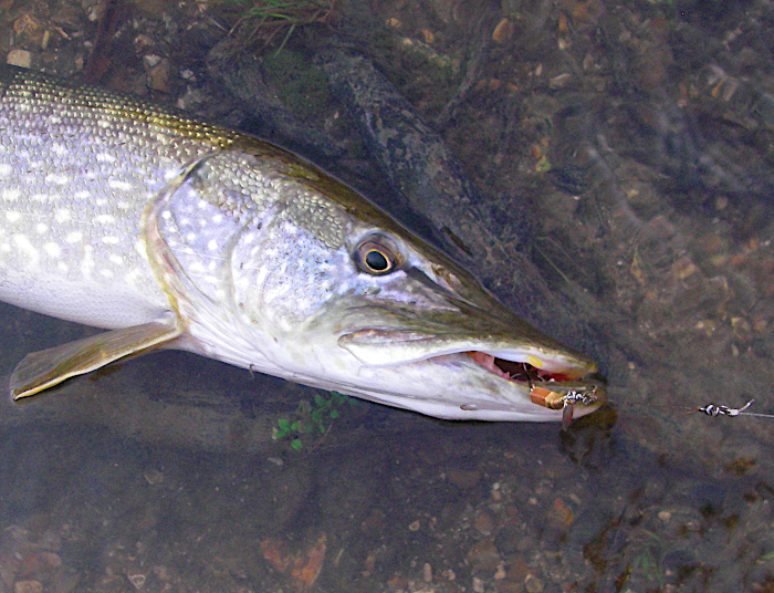 Of the twenty (Northern) pike in the ponds, each one was caught at least once, and one was caught no less than 7 times! The scientists said that the pike (even though the Dutch experiments showed that they quickly learn to avoid spinners) were about four times easier to catch on Mepps than were the muskies and three times easier than the tiger-muskie hybrids. Fish were handled many times but very few died due to hooking and even three deeply-hooked fish recovered and survived.