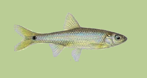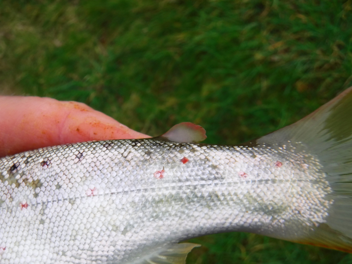 The back end of a seatrout smolt with its red, adipose fin (salmon smolts and parr have a clear or yellowish adipose).