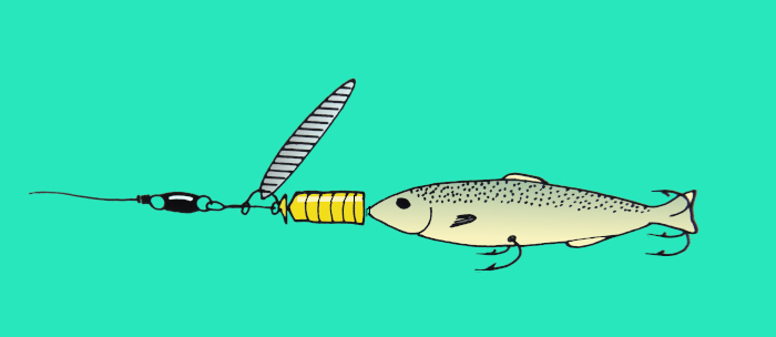 Diagram of a Mepps Mino showing the set up of the hooks.