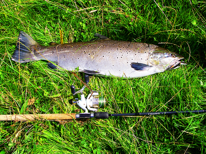 After returning the fish, I plodded on upstream, casting up and across and retrieving just fast enough to keep the lure working. For fifteen minutes, nothing, then suddenly, in mid-river a fierce snatch and a big sea trout launched itself into the air. My heart was in my mouth and for a minute or two I wondered whether it was well enough hooked on the small trebles. I managed to prevent the fish going downstream, with the strong flow, past a big hawthorn bush (impassable on my bank) and began to feel that I was in control. Of course, I'd left my net behind, so the next problem was how to extract the fish without falling in. I slithered down the bank and with one hand on the tail wrist managed to stop the fish swimming off. I put my other hand under the trout's head (avoiding the needle-sharp hooks) and with a heave managed to get it on the soft, grassy margin. Now it was easy. Remove the hooks, take a picture, remove a few scales to be read, weigh the catch (12.5lb) and slip it back. Whewww!!!