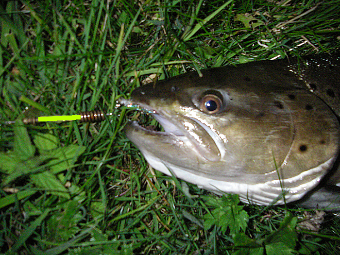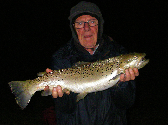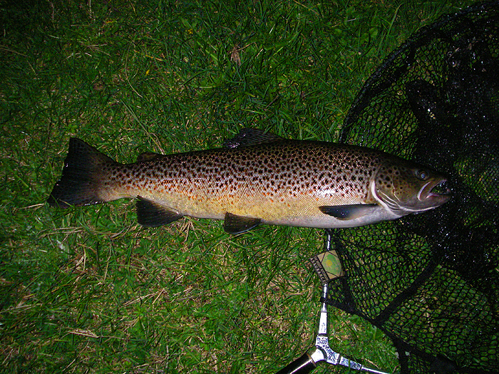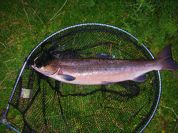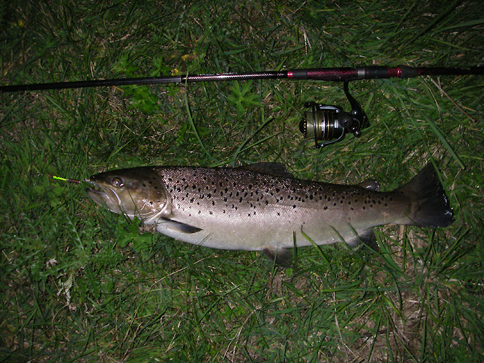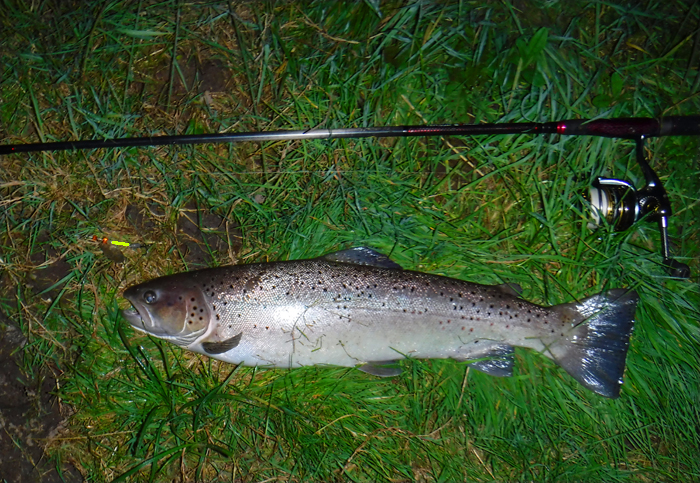I'd been fishing for almost an hour and was just thinking that it might be time to 'give them best' when I approached the last big pool. More in hope than expectation I cast the spinner well up into the pool and started to wind, just fast enough to avoid snagging while keeping the blade ticking over. "The lure must be almost at the lip of the faster water now," I thought. There was a fierce pull on the line and a big fish exploded from the water and hurtled downstream towards where I stood. Every few seconds the seatrout hesitated in its rush to leap again. Ten or a dozen times it flew into the air thrashing and splashing wildly while I simply hung on to the rod with my heart in my mouth. Even though I couldn't see too much in the gloom it was clearly a nice seatrout and I didn't want to lose it before landing it, weighing it and having a good look. After five minutes of hectic action the fish (and me too) was beginning to tire a bit. I had it more or less under control and swimming close to the bank where I stood.