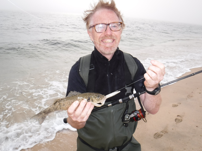 Richard with another early morning bass. Note the kelp buried in the sand.