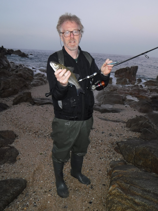 Richard's first bass caught, on his favourite plug, just after first light, from quite rough sea, over the rocks.