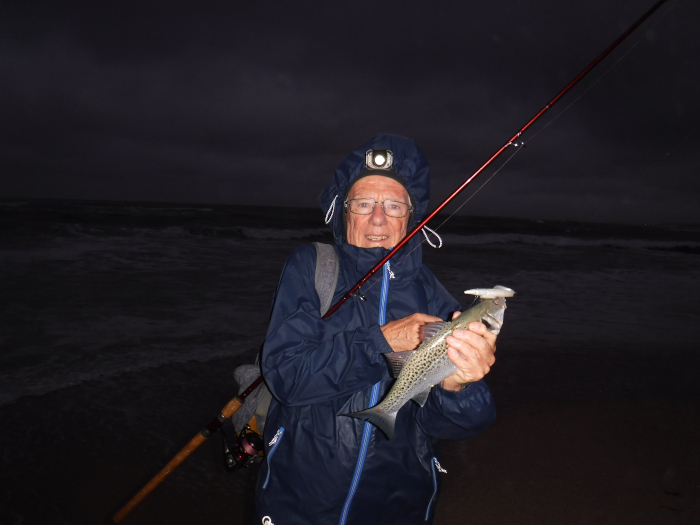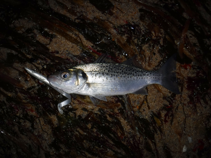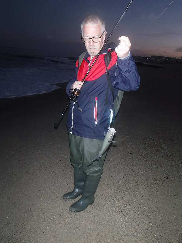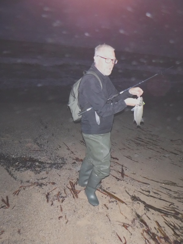 There were a few entertaining events - sadly, none of them were caught on camera. The first one was when Rich, concentrating on his spinning, put his foot on a rock covered in black slimy, algae and as I looked round I saw him ungracefully fall onto his back, with arms, legs and rod in the air like a distressed tortoise, as a wave swept over him. His other acrobatics involved, firstly, stepping, in the dark, over a steep, metre-deep 'step' in the sloping beach and falling to his knees as he saved the rod and reel from being buried in the sand. The third event was another ducking, much the wettest, when, as he tried to dodge a big wave, it whipped his feet from under him and dumped him on all fours in the heavy undertow. Of course I couldn't do anything but laugh. Rich had the last laugh of course, when he caught another couple of bass as I blanked again.