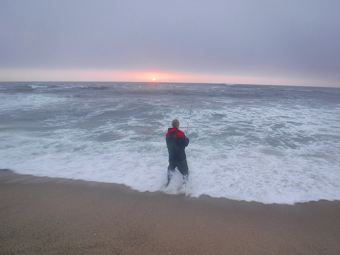 In the second week the surf was more typical and the waves were a good deal bigger. Things also blew up a bit and there was often more weed on the beaches and in the water. However, the quality of the fishing didn't really change. We still found it difficult to predict when and where we would get bites and were often surprised to find beaches which, for days, had been piled high with loose kelp suddenly buried under clean, deep sand. We pressed on and caught bass in a random fashion. Whatever the conditions the bites and fish often came in only a few centimetres of water as the waves finally swept up over the sand and around our booted feet.