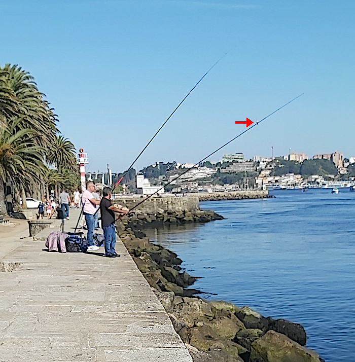 We now have a better understanding of what is going on. On the recent visit we had two walks along the long river-mouth jetty of "The Foz". On our evening, last light, walk we did a bit of spinning and I actually hooked and dropped a mackerel on my wedge (species 1). The vast majority of the (?100+) anglers who were in action were float fishing with the very long, fine-tipped rods. They used extremely large floats (duck-egg sized), mostly containing bright green lights and beneath them were suspended a variety of small, baited hooks. The fish that we saw caught were a scad (2), a couple of small grey mullet (3) and a small school bass(4). One angler spinning with a small, metal lure had a mackerel and a scad. A couple of days later, on a sunny morning walk in the same area the anglers were doing more or less the same thing, using large orange coloured floats and catching similar fish, mostly less than 0.5kg (1lb) in weight, plus a few sardines, and netting them using small (30cm) diameter nets on long poles so that they could reach the water. large fish did not seem to be on the agenda, although it is possible that they are at other times of the year.