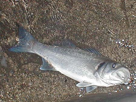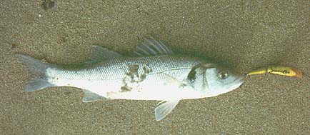 "It was good to talk to you again down on the shore (I am the Geordie you met the other day!) (Incidentally we met and chatted in the same place last year after which Paul lost my E-MAIL address.) and I thought you might be interested in our fishing experience last Sunday. We spent the day drifting (in their small boat) and spinning or trolling plugs and the result was ten fish landed (and ten put back) but all caught by my son fishing next to me! We found that the bass were not close in due to the bright conditions but in about 15 - 20ft of water. The exception was a bay where the sea was disturbed and cloudy. The interesting result from the days fishing was the fact that the only difference between what my son was fishing with and my own lure was colour. We both had on 31/2" jointed Rebel plugs on 10ft of fluorocarbon joined to braid. I was using a brown / gold plug that has done well in the past and my son was using a black / silver plug. It became obvious after four or five fish that colour was making a difference but I decided to continue the experiment for the rest of the day. 10 - nil is a definite result! The best fish was 61/2lb, the next 4lb and the rest 2 - 21/2lb.